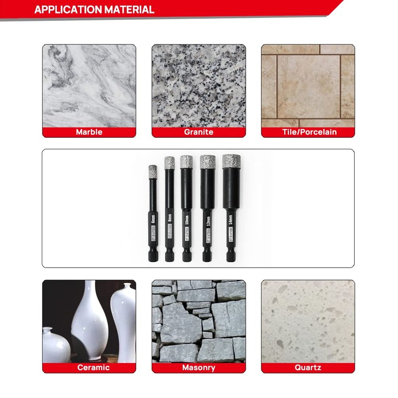- For drilling tile/ceramic, marble& granite, masonry, concrete, hard plastic,etc