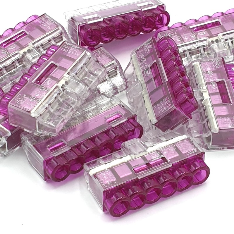 - 10 pieces of 6-Way/Pole push in wire terminal in transparent/violet colour from HelaCon Plus Mini electrical connectors range