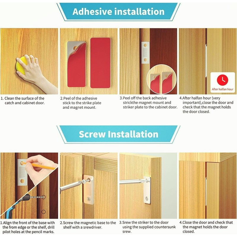 - [Easy to use] : Stronger than 3M stickers, no holes and screws can be easily installed magnetic lock, save time and effort, do not damage the cabinet or door, special use can be provided with screws.(Before installation, should be clean to attach the grab strip and cabinet door surface, in addition, please close and open the door after 12 hours, so that the adhesive compound adhere to this surface)
