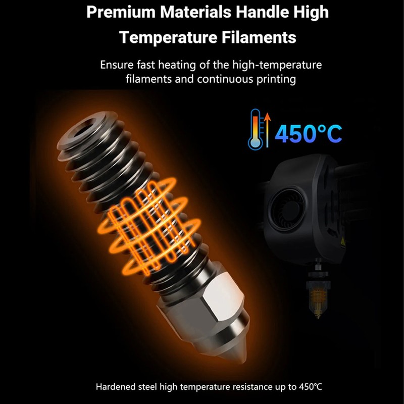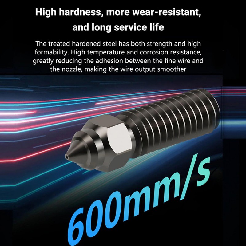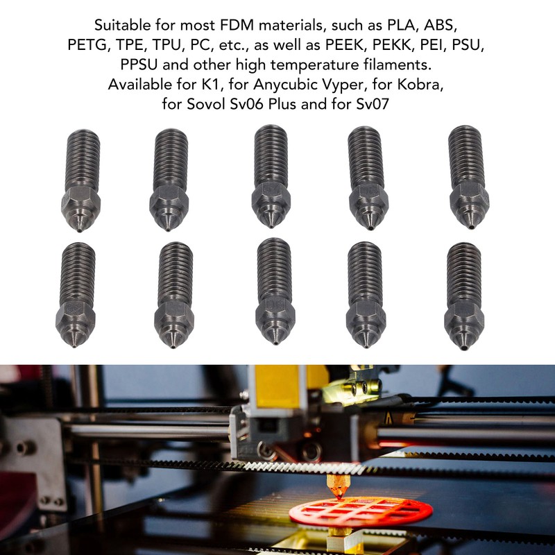 1、HIGH COMPATIBILITY: This 3D printer nozzle set is compatible with for K1, for Anycubic Vyper, for Kobra, for Sovol Sv06 Plus, and for Sv07. 2、FAST AND SMOOTHLY: Thermal conductivity of hardened steel nozzle is up to 330W/m·k for high flow, high speed printing, ensuring even heating for smoother extrusion. 3、UNIFORM NICKEL COATING: Larger volume than regular nozzles, supports 600mm high speed printing, reduces adhesion of fine metal filaments for smoother extrusion. 4、MATERIAL COMPATIBILITY: Extruder nozzle kit is suitable for most FDM materials like PLA, ABS, PETG, TPE, TPU, PC, and high temperature filaments. 5、NOZZLE SPECIFICATIONS: Includes 0.2mm 1pc, 0.4mm 4pcs, 0.6mm 2pcs, 0.8mm 2pcs, 1.0mm 1pc nozzles, with high flow and heat resistance performance.
