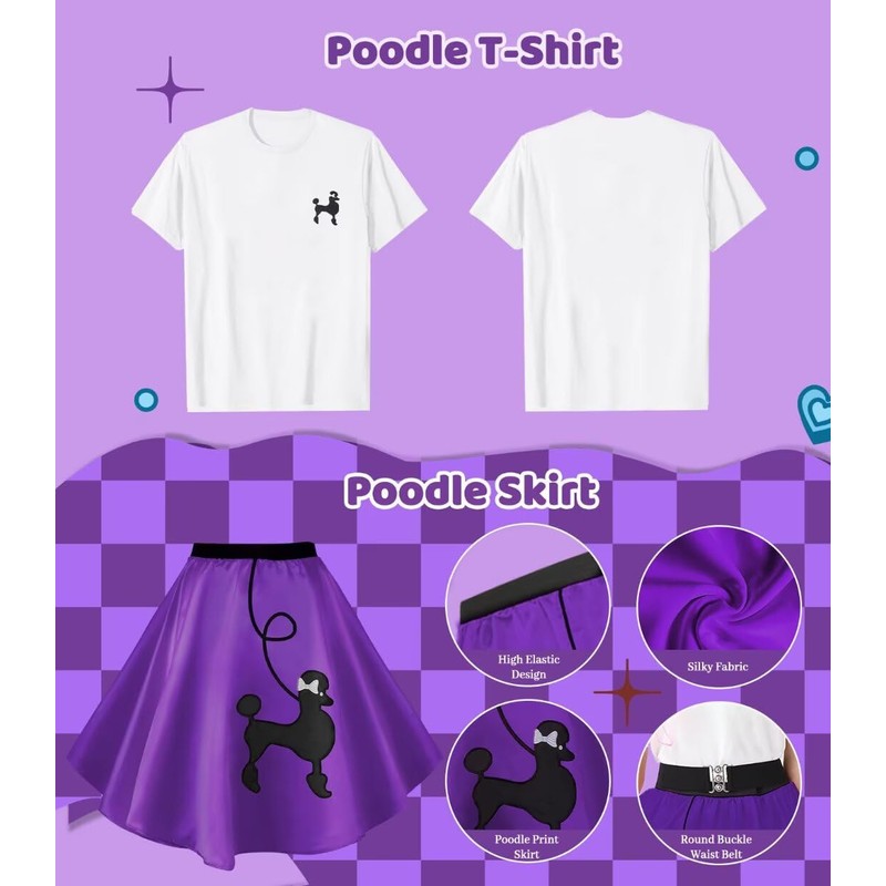 - Package Included 10Pcs - 1 x polka dot skirt, 1 x poodle T-shirt, 1 x poodle socks, 1 x chiffon scarf, 1 x headband, 2 x plastic eyeglasses, 1 x belt, 2 x earrings, this 50s polka dot skirt and Tshirt set comes with full the accessories you can easily mix and match to create a variety of stylish and nostalgic looks, transport you back to that vibrant and charming era in an instant!