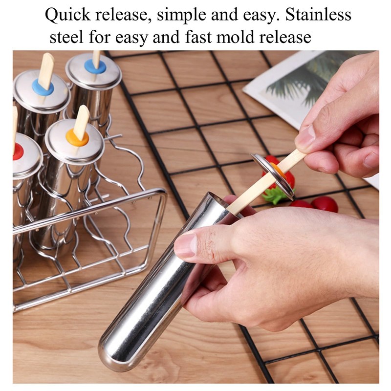- High-quality Material: This stainless steel popsicle mold is designed as an eco-friendly alternative to plastic popsicle molds. The materials used include food grade 304 stainless steel for the molds and the rack, bamboo for the sticks.