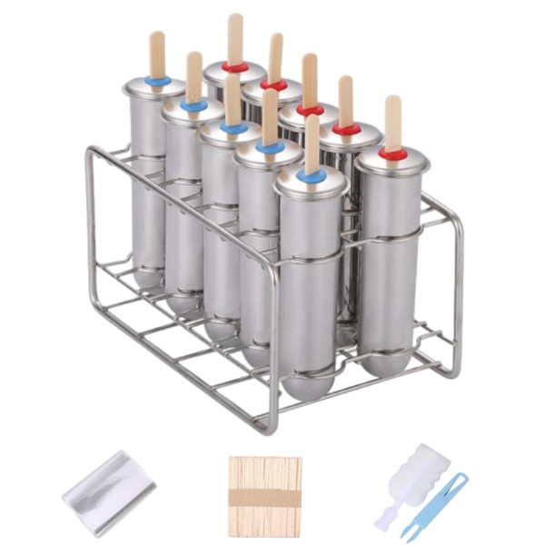 10Pcs Stainless Steel Popsicle Molds and Rack Ice Cream Popsicle Molds with 10 Round Ice Pop Makers + 100 Reusable Bamboo Sticks + 20 Bags + 1 Cleaning Brush + 1 Rack (Silver (Round))