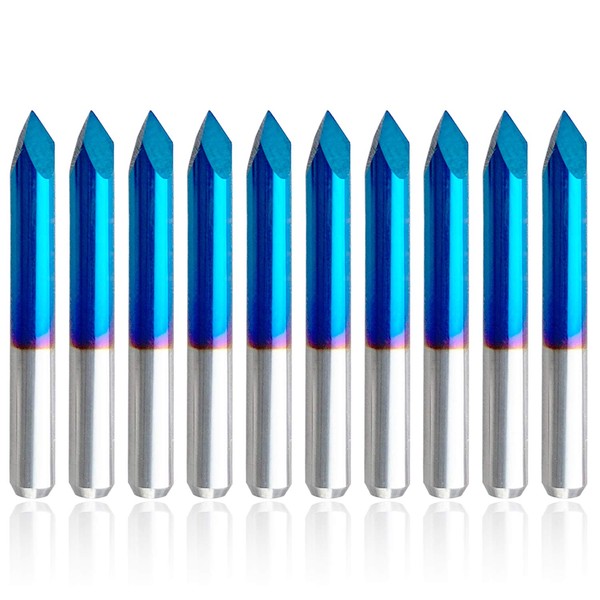 FoxAlien 10pcs Triangular CNC Router Bits V-Bit, 60 Degree 0.1mm Engraving Bits, 1/8” Shank Nano Blue Coating Sharp Pyramid Bits for Acrylic Wood MDF Aluminum Lettering Sign Making