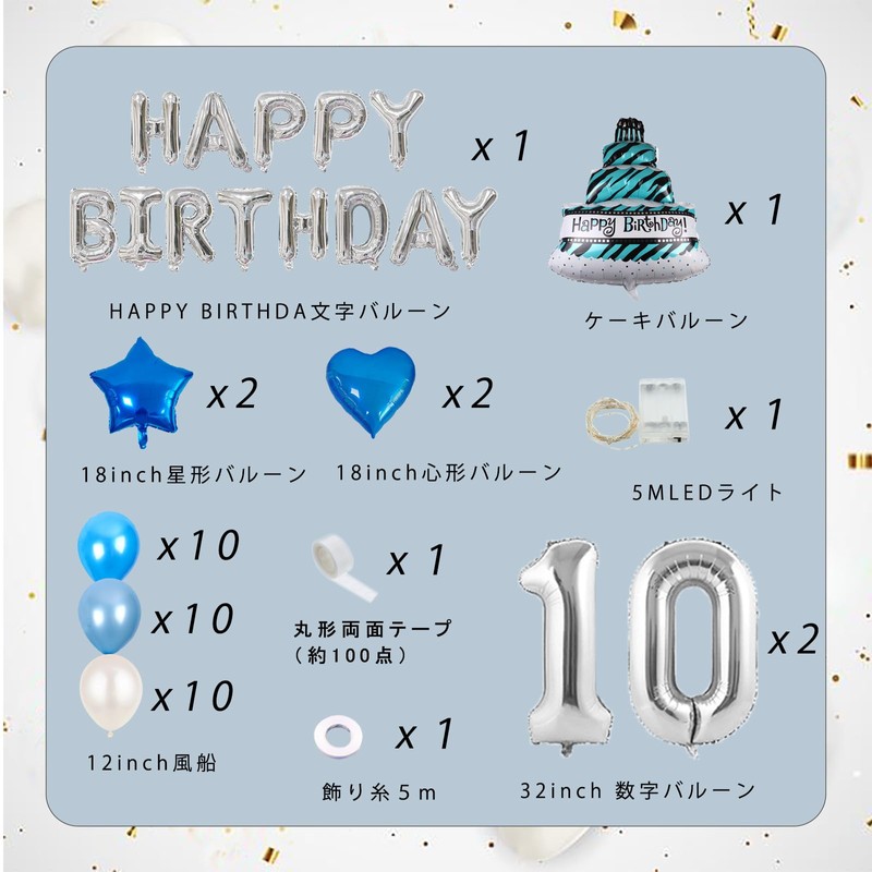 - Product Contents: HAPPY BIRTHDA letter balloon x 1 (silver), illumination light, 16.4 ft (5 m) LED light x 1 (battery powered), AA batteries x 3 (sold separately), birthday cake balloon x 1 (blue), star balloon x 2 (blue), heart shaped balloon x 2 (blue), DEEP blue balloons x 10, blue balloons x 10, white balloons x 10, balloon x 10, balloon x 10, balloon x 10, balloon x 10, balloon x 10, balloon hanger x 10, balloon hanger. 5mx1, 1 x Double-sided tape for balloons (approx. 100 pieces)