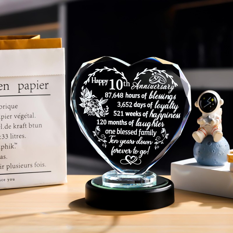 If you are looking for a special gifts for your loved to celebrate 10th anniversary date, our heart keepsake with LED base which engraved Happy 10th Anniversary is a wounderful choice. This can be a good 10th wedding anniversary gift for women, men, wife, husband, sister, brother or other someone you love.