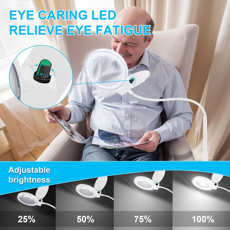 • 36 Dimmable LED Lighting: Our magnifying lamp is equipped with 36 energy-saving LED lights that provide customizable brightness to meet your specific needs. Simply turn the button to find the best lighting for reading, crafting, or any close work. The LED light source is carefully designed with anti-glare and flicker-free features to provide a comfortable and safe viewing experience