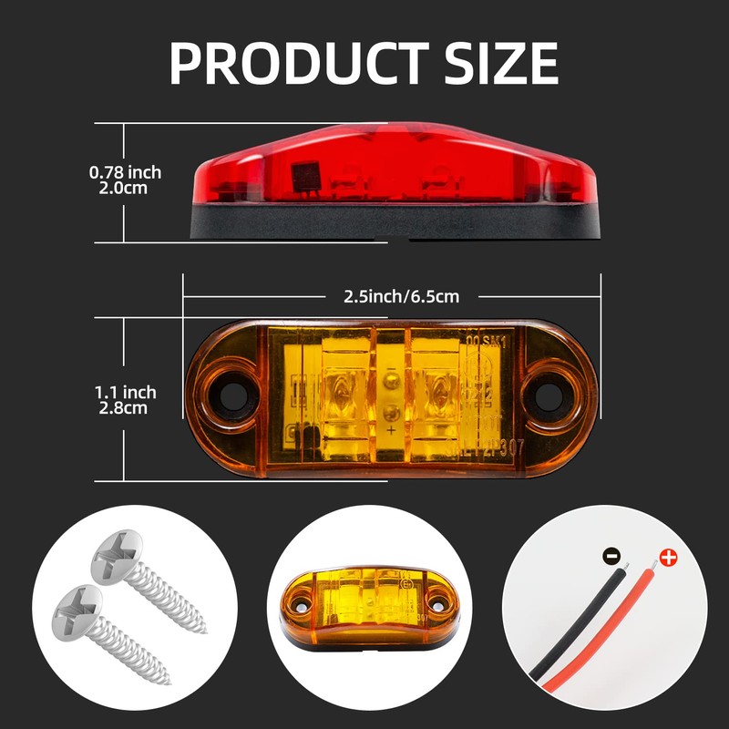 - (Latest styles) : the package comes with a total of 10 pieces Amber and 10 pieces Red of 2-LEDs marker lights for trucks in 2 different colors, and 40 pieces of screws.