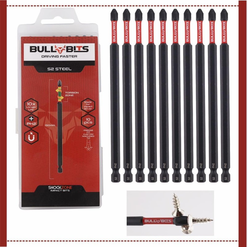 10x Bull Bits 150mm PH2 Impact Screwdriver Drill Driver Bits Set Phillips No.2 Compatible with DeWalt, Milwaukee, Bosch, Makita, and More