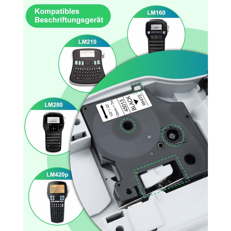 - Box contents: (not OEM) 10 x compatible with Dymo labelmanager labelpoint tapes 12 mm 45013 black on white