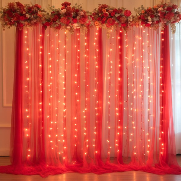 - 【Elegant Red Sheer Backdrop with Lights】Our red backdrop curtain are crafted from high-quality delicate soft and smooth tulle.The fabric is so dreamy. It's like a semi sheer dress that flows in the wind, so romantic. And it's also lightweight to wear, the wind was able to blow it for a dramatic effect.