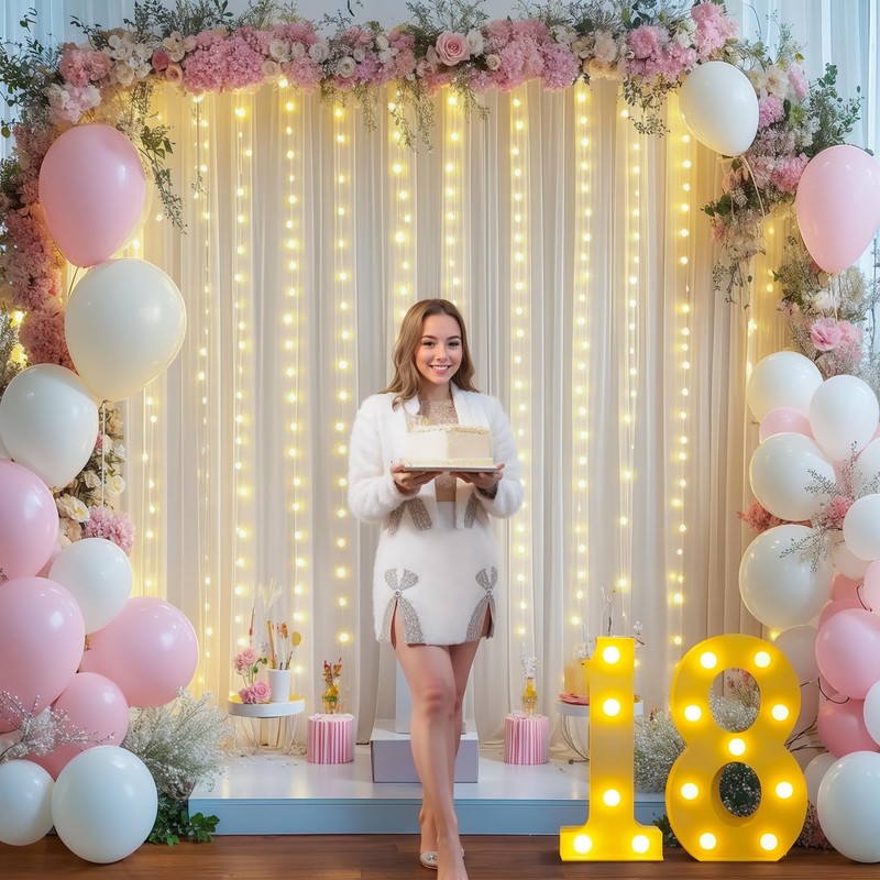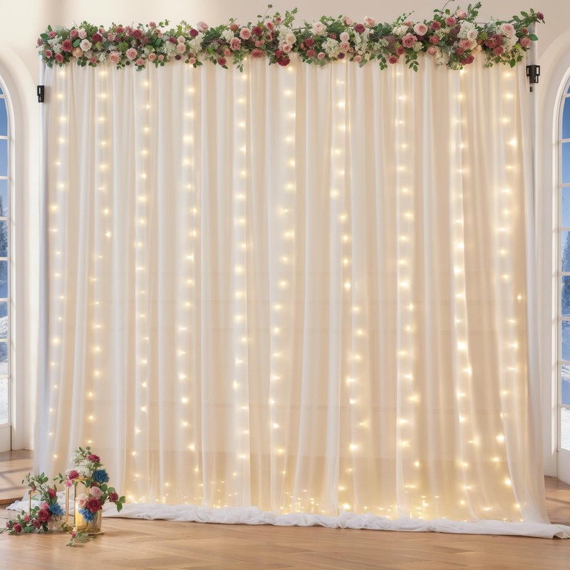 - Easy Caring Curtain With Lights Backdrop —— Easy to care with hand wash or machine gently with a laundry bag. Sheer backdrop curtains for weddings can hang to dry quickly and keep vertical. Do not bleach or twist. The soft white color is gorgeous, and the lights add a magical touch