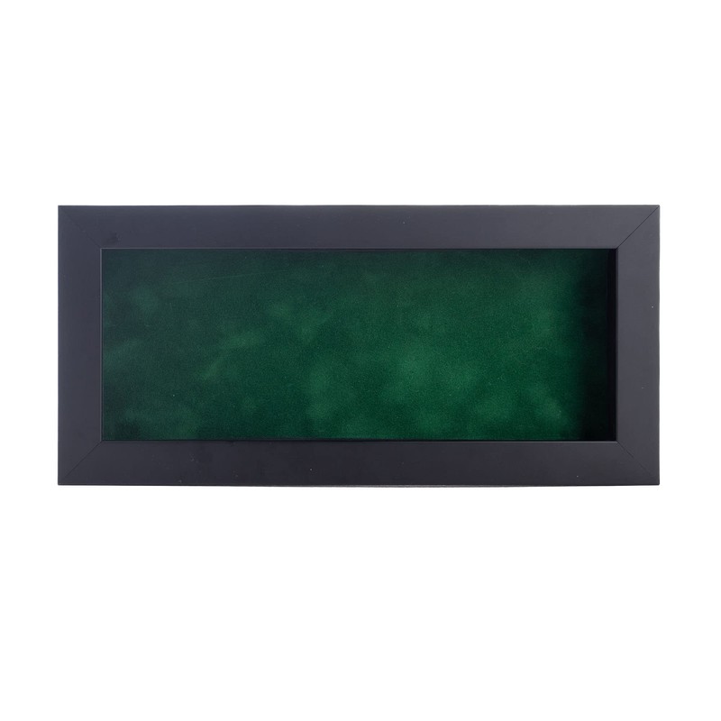 Black wood shadow box frame with interior size of 10x20 inches by 1 inches deep. Features our 4-ply forest green acid-free suede backing. Usable depth is 7/8 inches. Overall frame size is 11.5x21.5 inches. Includes shatter-resistant acrylic front, acid-free backing and wall hanging hardware. Proudly made in the USA!