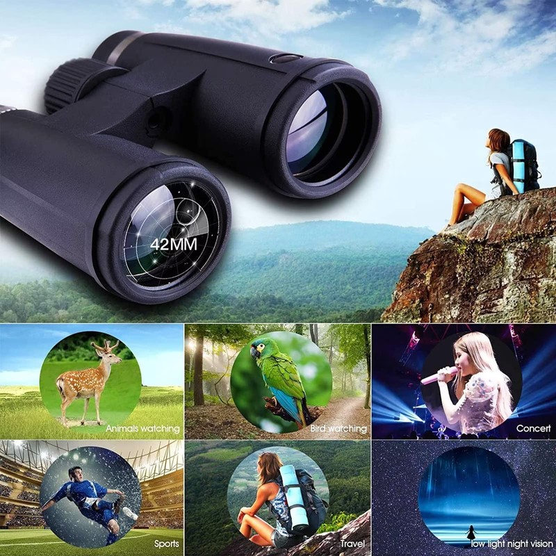 - 【Professional Binoculars】10X power magnification (optimal magnification), 42mm large objective lens, large field of view good for fast moving subject, high clarity and brightness, perfect for bird watching, hunting, travel, opera, concert, sports games, safari.