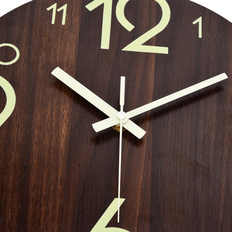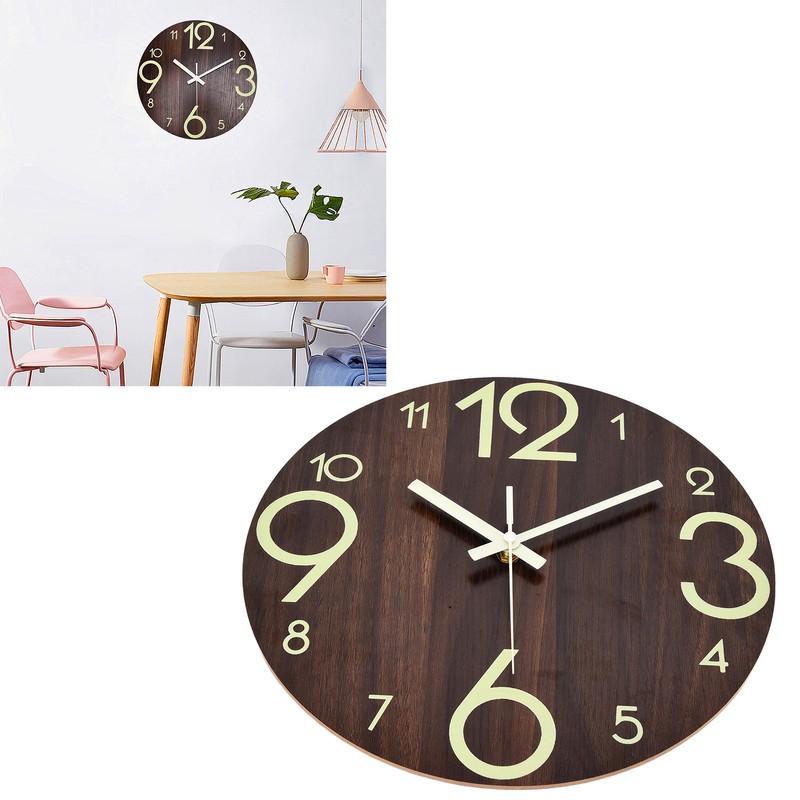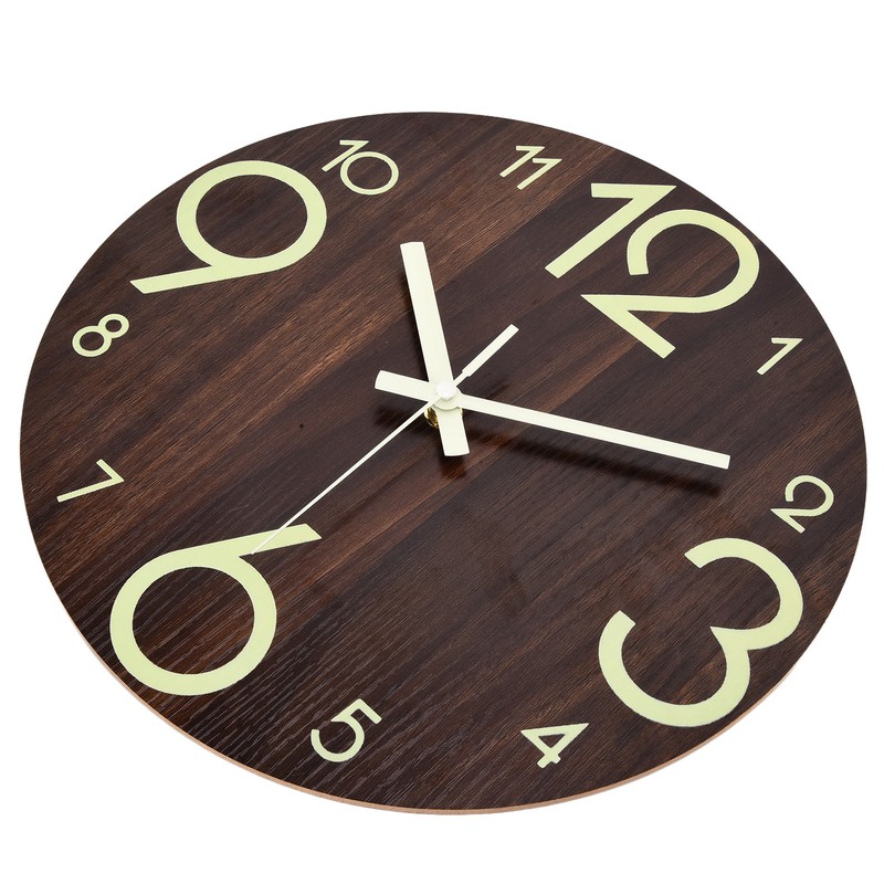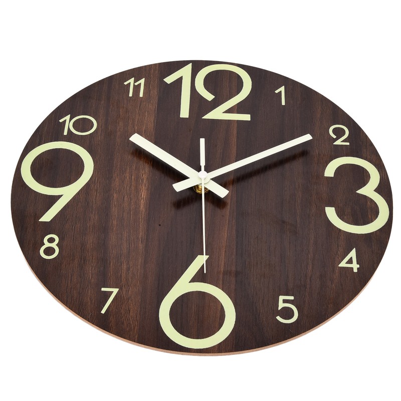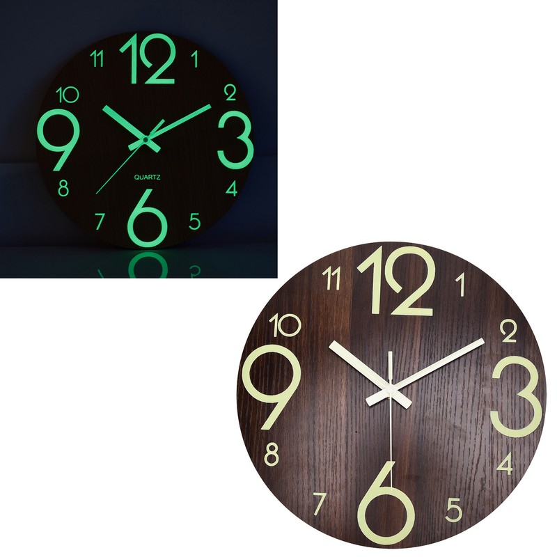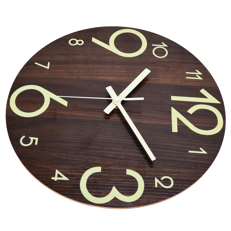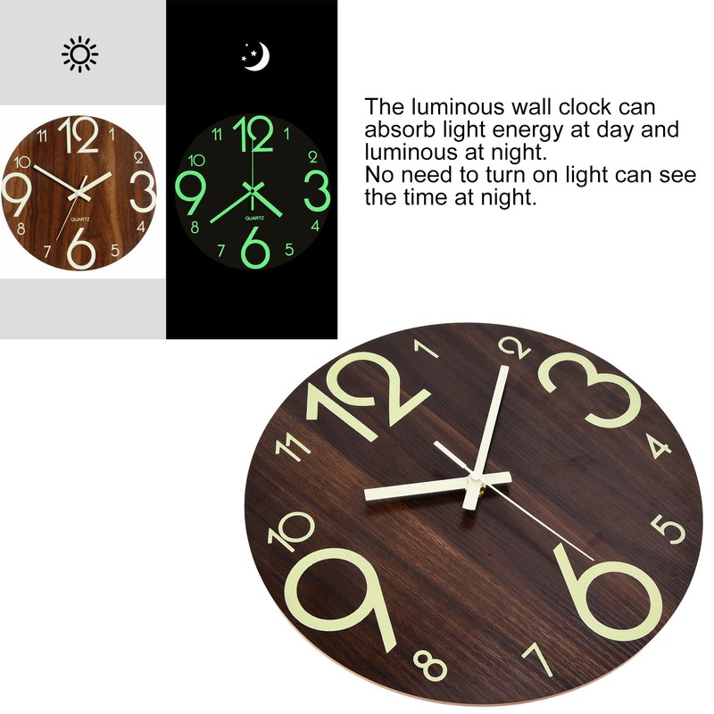 1、Silent Wall Clock: Precise quartz movement ensures accurate timing and absolutely silent environment. 2、Night Light: The luminous wall clock can absorb light energy at day and luminous at night. No need to turn on light can see the time at night. 3、High Quality Material: Wooden luminous wall clock is made of fibreboard, non toxic, durable and has excellent color fastness. 4、Widely Use: The wooden wall clock perfect for dining room, living room, bedroom, classroom, study room, kitchen, office and meeting room. 5、Easy Installation: Back slot design offers easy installation, convenient for hang, save your time and energy.
