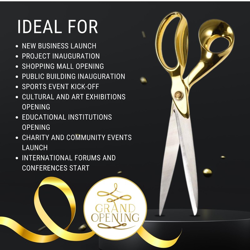 • Sharp scissors heavy duty are widely used for opening because of their shiny gold design. Ribbon cutting ceremony scissors are 11" long, 3.3" wide, the length of blades is 5". This size is perfect for grand opening ceremonies. An extra size of large ribbon cutting scissors ensures an ideal experience for any cutting ribbon ceremony