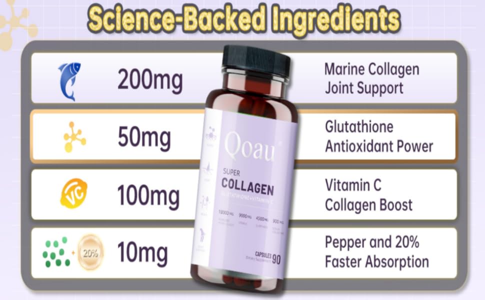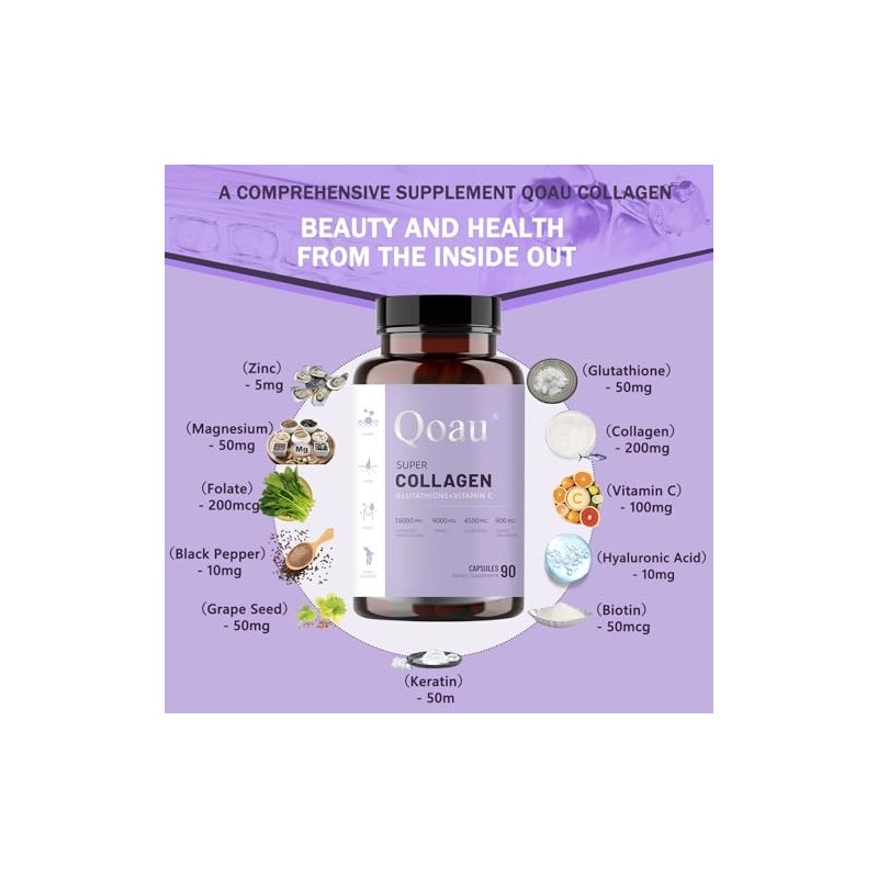 Product Benefits | Efficient absorption: Black pepper extract significantly enhances the absorption and utilization of key active ingredients such as glutathione and collagen., Golden antioxidant: Glutathione+Vitamin C+Grape seeds, triple potent antioxidant, resist damage, brighten skin tone and anti-aging., Nourishing hair nails: Biotin+keratin, targeted to enhance hair toughness and nail health, improve fragility and breakage., Nutritional foundation: Folic acid+magnesium+zinc, supports cellular health, metabolism, and immunity, providing an intrinsic foundation for beauty., Strong and tough skin rejuvenation: Collagen peptide+hyaluronic acid+vitamin C synergistically enhance skin elasticity, hydration, and reduce fine lines., non - GMO & gluten - freeEfficient absorption: Black pepper extract significantly enhances the absorption and utilization of key active ingredients such as glutathione and c…See more |