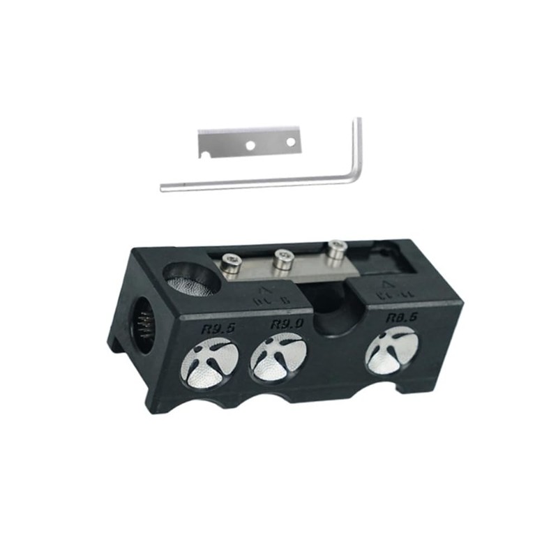 Place the polished billiard cue tip on the curvature detection and comparison hole to calibrate the curvature of the cue tip.
