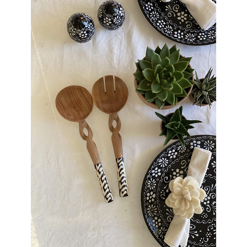 These 11 inch salad servers are carved from olive wood with a cow bone handle. The patterns on the handles are created by melting wax on the white bone and dipping the handles in a dark dye. The intricate carving of the handles gives the appearance of two thick twisted vines. Treated with oil they should last a life time. Handle designs will vary.