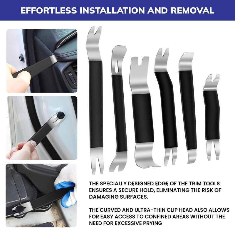 - Effortless installation and removal: The specially designed edge of the trim tools ensures a secure hold, eliminating the risk of damaging surfaces. The curved and ultra-thin clip head also allows for easy access to confined areas without the need for excessive prying