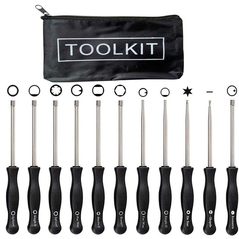 - You will get: 11 carburetor adjustment tools+ 1 carburetor cleaning kit+ 1 tool carrying bag.carburetor adjustment tool kit (11pcs) include : Eccentric + 21 Teeth Splined + 7 Teeth Splined + Single D + Small Head Single D + Double D + Pac Man + Small Head Pac Man + Hexagon + Shapde + Six Star.