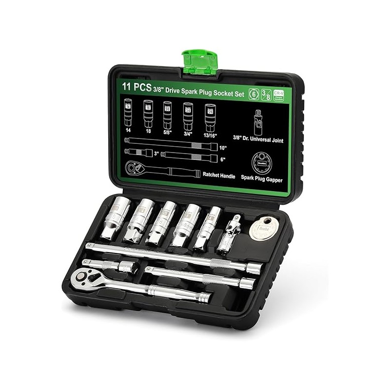 11-Piece Spark Plug Socket Set with 3/8" Drive Ratchet Handle, Spark Plug Gapper, Universal Joint and Extension Bar, 5/8", 3/4", 13/16", 14mm, 18mm, CR-V Sockets with Rubber Retaining Rings