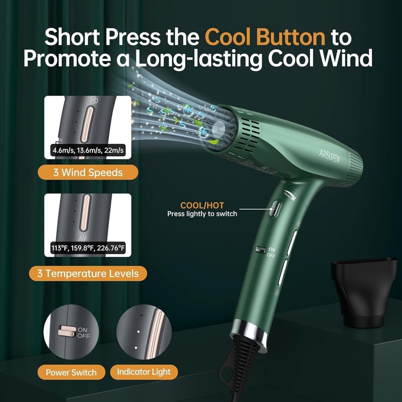 Protect Hair: The negative ionic blow dryer equipped with a built-in microprocessor and temperature sensor to intelligently monitor air outlet temperature at a high frequency of 1000 times per second. Effectively regulates high temperatures to prevent hair overheating and damage.