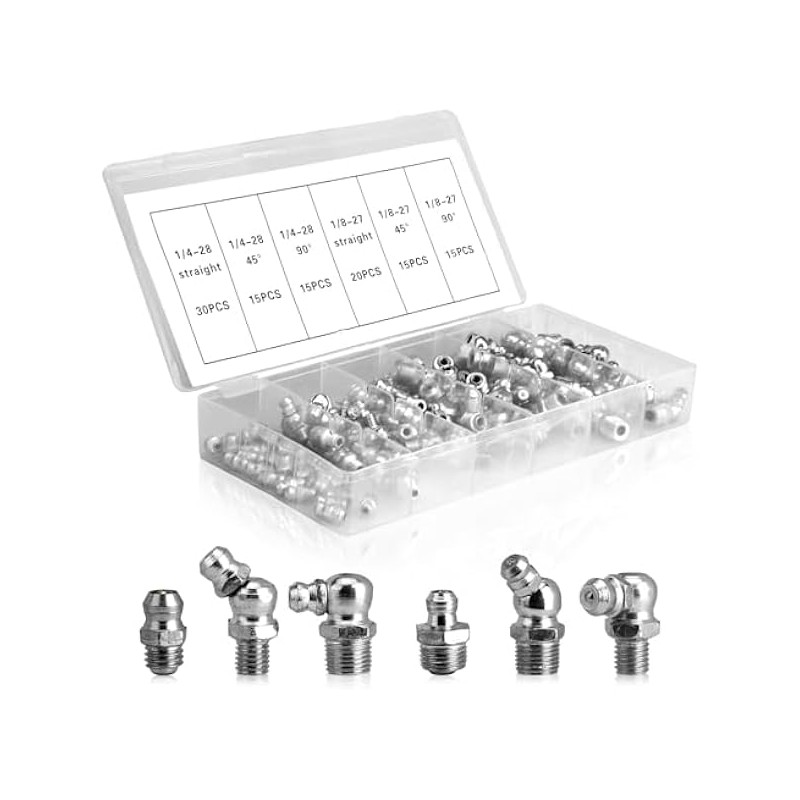 110Pcs Grease Fittings Kit, SAE Grease Fitting Assortment: 1/4" 1/8" Straight 45 90 Degree Angled Zerk Grease Fittings, Galvanized Steel Grease Zerk Kit for Replacing Broken Grease Fittings
