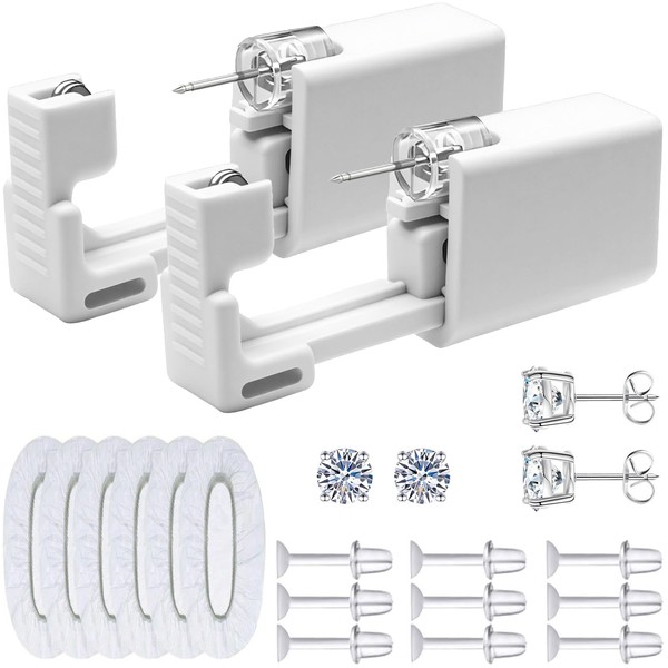 Disposable Ears Piercing Guns, Easy Self Piercing Kit with Stainless Steel CZ Stud Earrings, Suitable Anyone Wanting to Pierce Ears at Home (Silver- White)