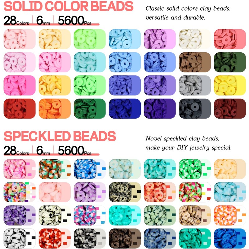 - The clay beads are made of high-quality non toxic, environmentally friendly soft polymer clay, 100% safe, bright colour, lightweight, durable and comfortable to wear. It is also skin-friendly and waterproof, not easy to fade, you can wear it at the pool, bath or beach. The diameter is 6 mm, the hole is 2 mm and the thickness is 1 mm, the perfect size for jewellery making