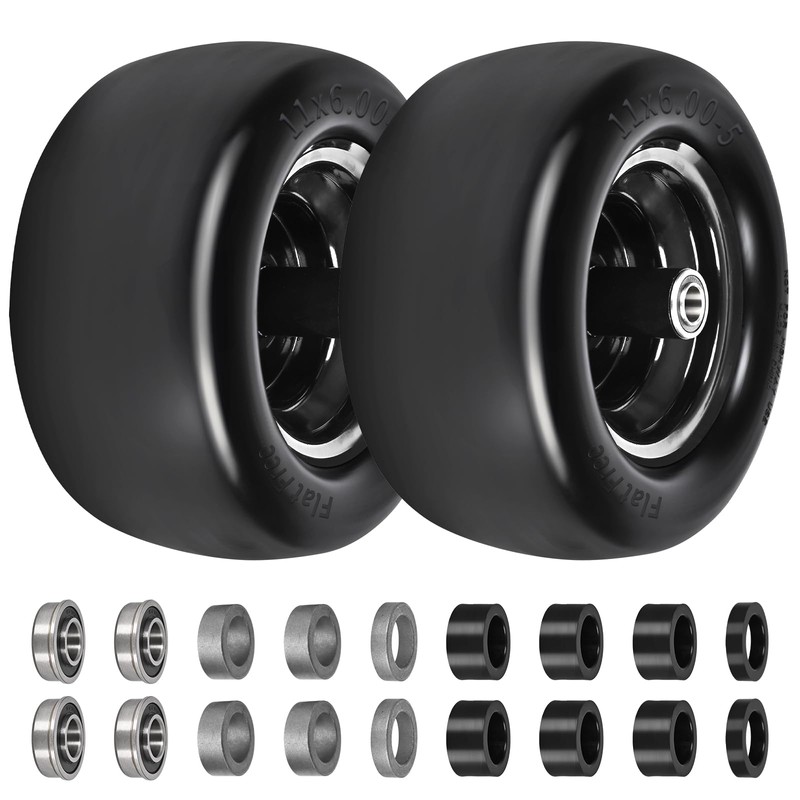 - 🔧 11x6.00-5 Flat-Free Front Tires – Standard Size Solid 11x6.00-5 lawn mower tire and wheel assembly. Tire diameter: 11", width: 6", rim: 5". Centered hub: adjustable from 6" to 8". Includes 3/4" axle bore (installed) and 5/8" bushings. Compatible with common lawn tractors and front caster assemblies.