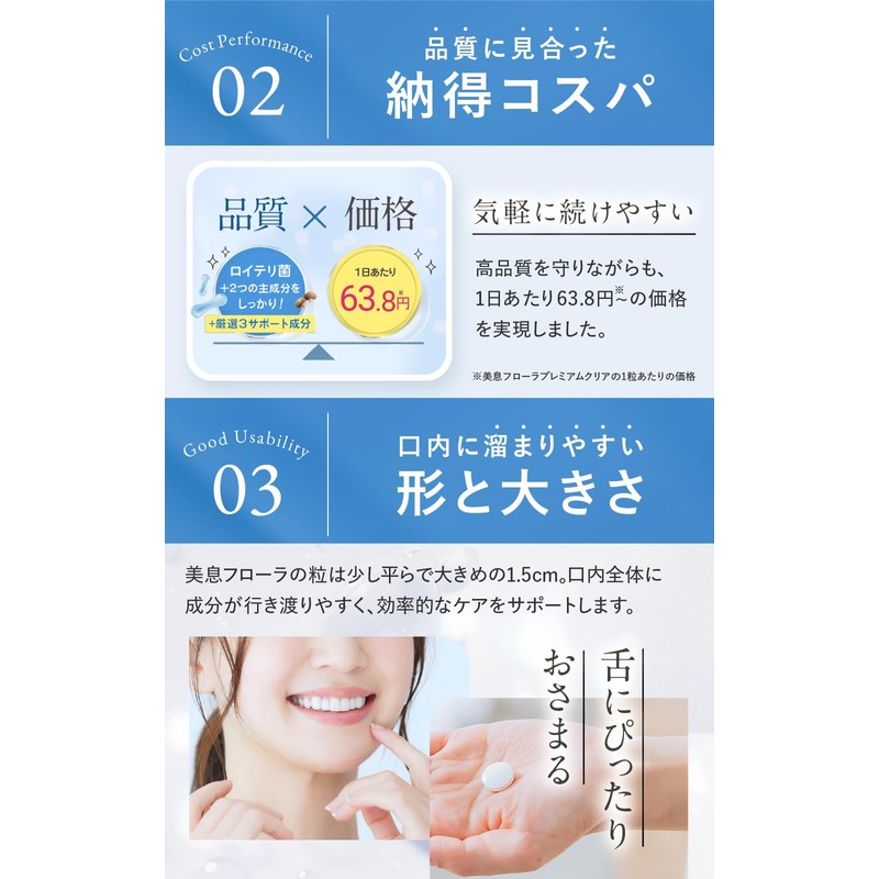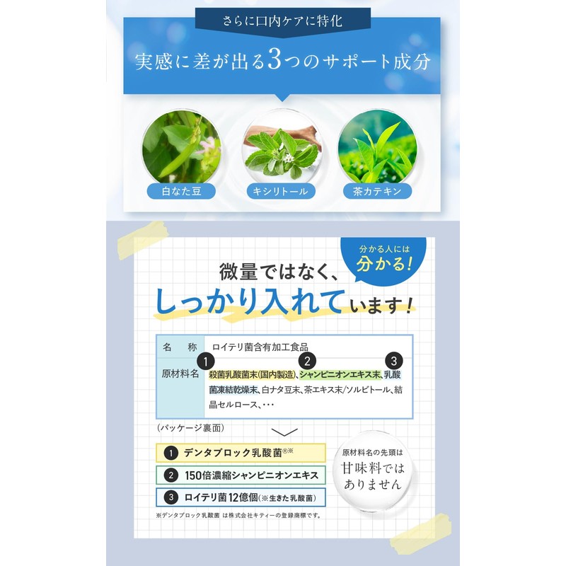 - ✅【こだわり成分をしっかり配合】美息フローラは、確かな成分のみ(L-ロイテリ菌、特許成分デンタブロック乳酸菌️、特許成分150倍濃縮シャンピニオンエキス、なた豆、キシリトール、茶カテキン)を厳選配合。主成分を推奨量しっかりと配合し1粒に凝集しております。