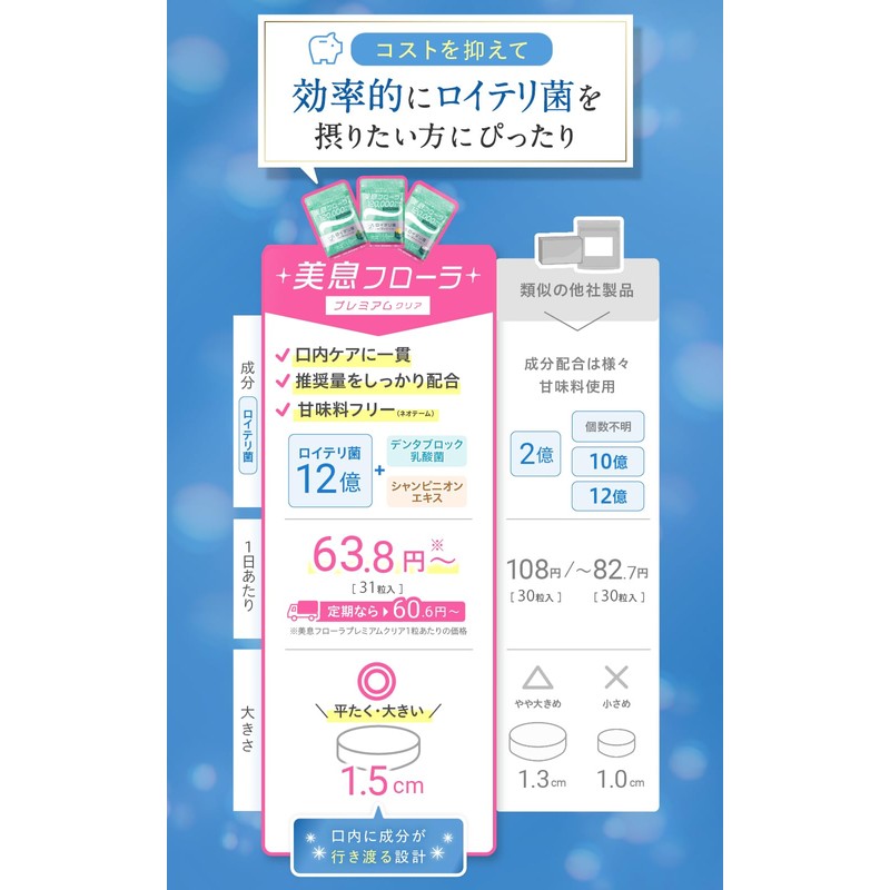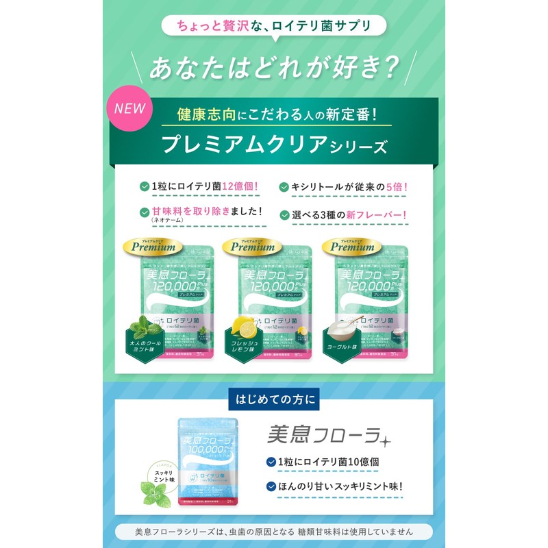 - ✅【健康志向にこだわる人の新定番】美息(びいき)フローラは、『生きたロイテリ菌がしっかりとれる』をコンセプトに、歯科医師等に推奨されている ロイテリ菌 を、業界最高水準『1粒に12億個(1袋に372億個)』配合したエチケットサプリメントです。弊社リピート率No.1の美息フローラから甘味成分を一部除き、代わりにキシリトールを従来の5倍量配合!【おいしさピカイチ!フレッシュレモン味】