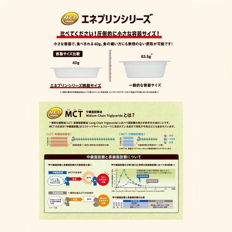 - 食べきれる40gで驚きの160kcal、MCT6g、たんぱく質3.5gを含んでいます。やわらかく、離水が少ない物性で、のみこみが困難な方にも食べやすくなっています。