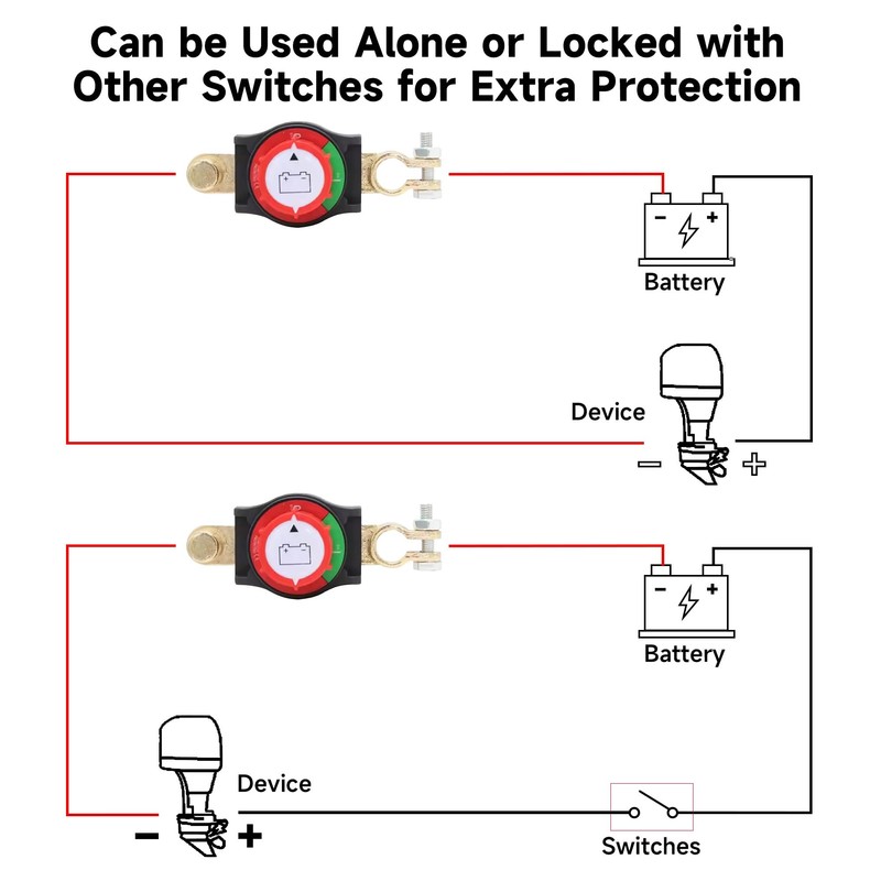 - 【Widely Used】: This versatile Battery Disconnect Switch is widely used in cars, boats, RVs, ATVs, UTVs, and solar power systems, making it perfect for any 12-48V electrical system that needs isolation and protection.