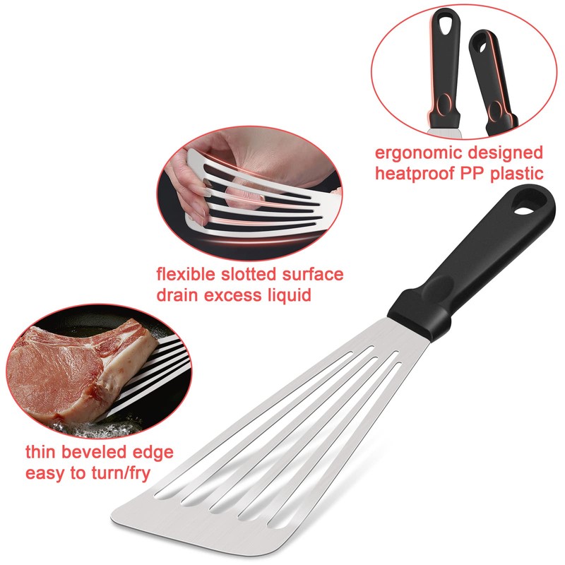 - [EXSIQUSITE DESIGN] Slender slotted surface helps to remove excess grease or liquid, Slight beveled end makes it much easier to slide under food without breaking, Flexible enough allow you to apply force to your food by pressing, Large hanging hole for convenient storage