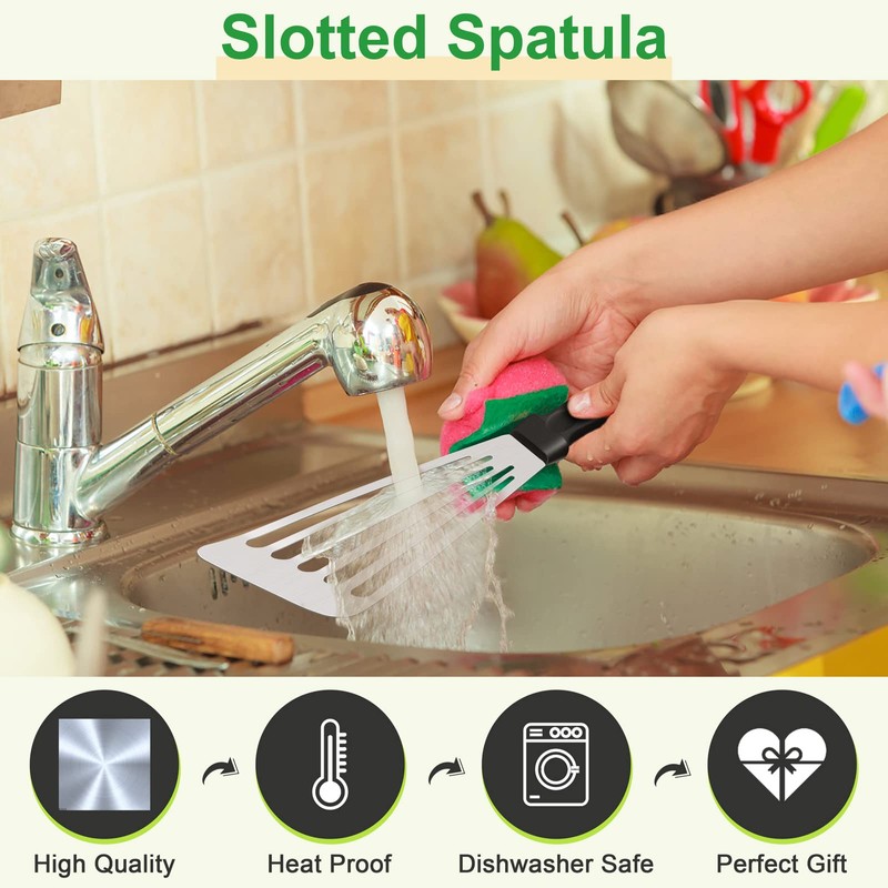 - [DISHWASHER SAFE] Both slotted turners are the same size 12.5x3.2 inches, Suitable for large pieces like sandwiches, a whole fish, filets, steaks, smash burgers, and delicate stuff like eggs and omelettes, pancakes, bacons, potatoes and veggies, Bonus extra 2 S-Hooks