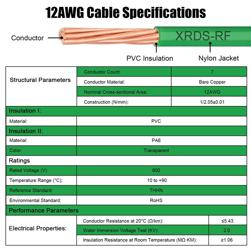 - High-Quality Bare Copper Conductor – 12 AWG stranded wire with bare copper conductor for superior conductivity, ensuring optimal electrical performance.
