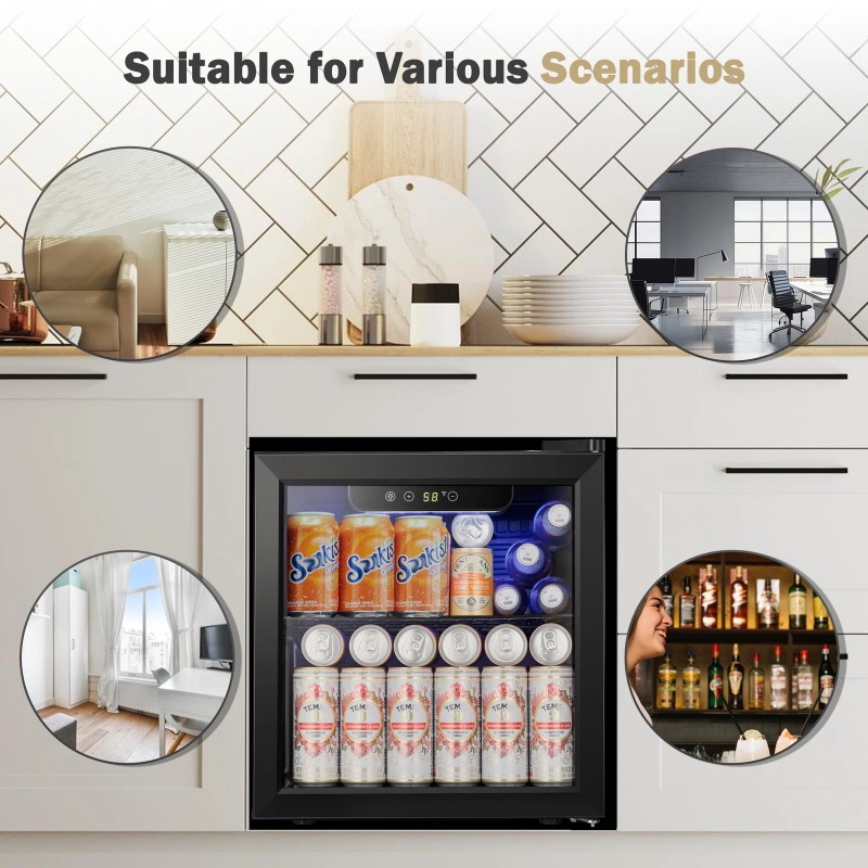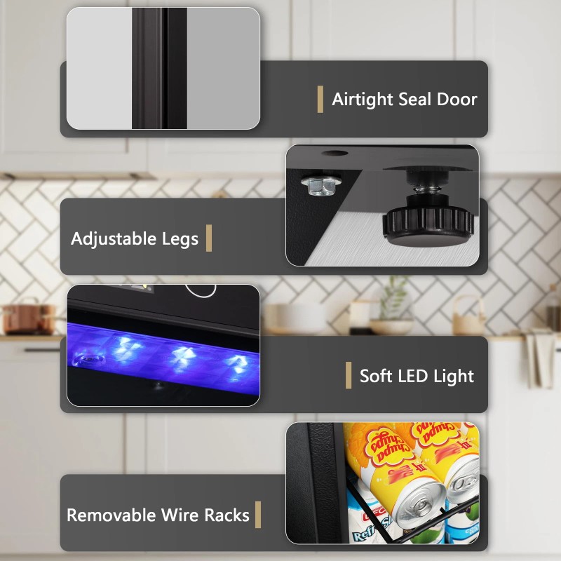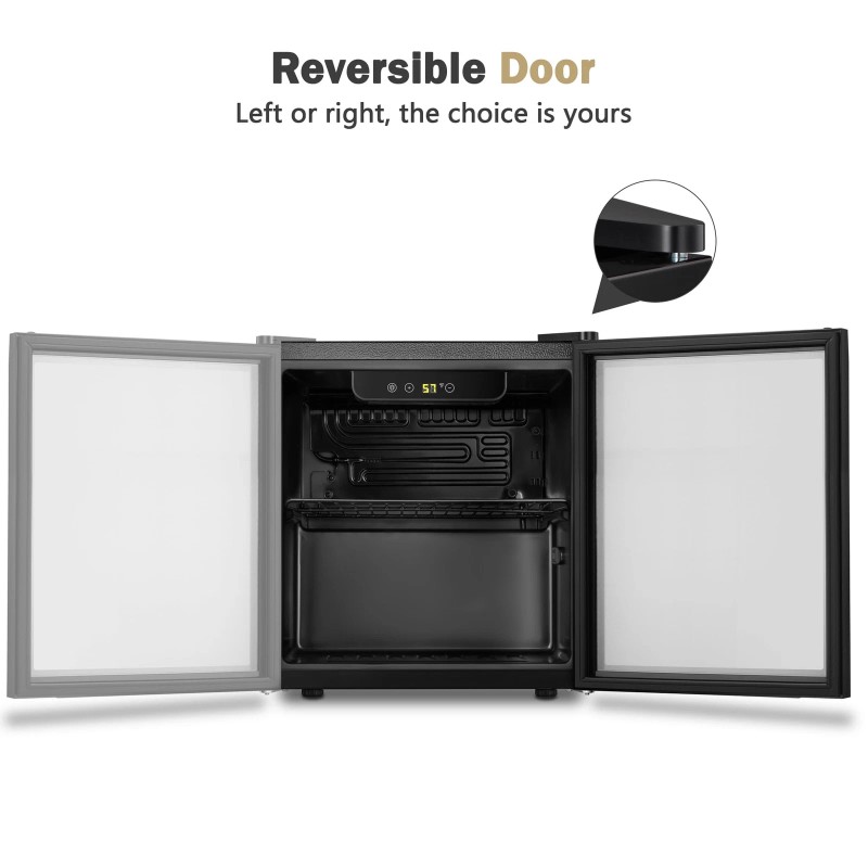 Adjustable Thermostat - 7-Level Temperature Control Knob. Operating temperature range is 40°F - 61°F. This temperature ensures your drink is perfectly chilled, ensuring your wine always tastes rich and fresh. Easily monitor and adjust the cooler's internal temperature with its smart temperature control and LED display. The interchangeable design of the left and right doors facilitates the selection of storage locations, adapts to the high-quality needs of different people and different locations. Quiet and compact, this stylish wine cabinet is ideal storage space for red wine.