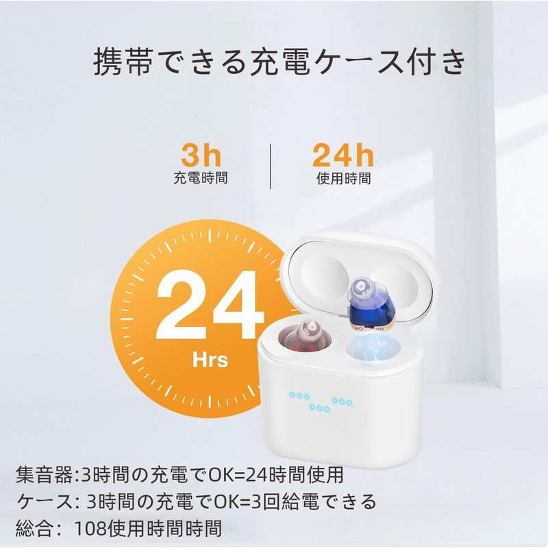 - 【携帯できる充電ケース付き 】携帯できる充電ケースは軽く精巧で便利。ポケット内でいつでも充電できます。速く充電,長く使用できる: 集音器は3時間の充電でOK、約24時間使用できる。 ケースは3時間の充電でOK、3回給電できる。 総合:108使用時間時間のバックアップ充電ケースで、あなたの生活をサポートします。ワイヤレス充電ケースを持ち歩けば、いつでもどこでも集音器を充電できます。