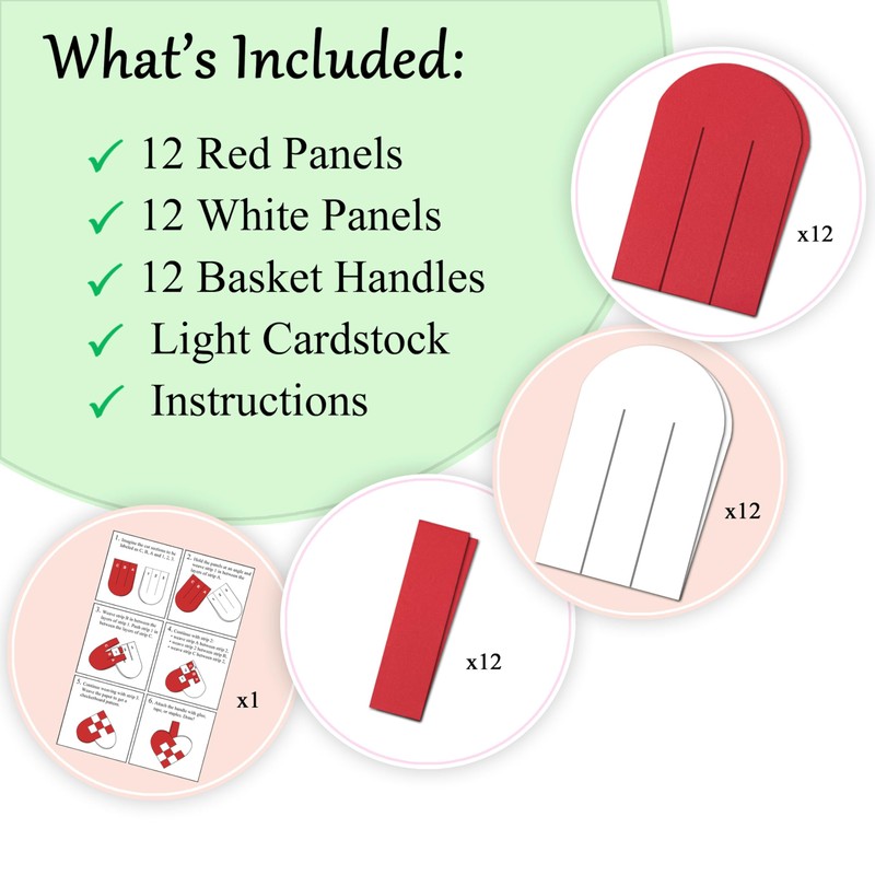- Includes: 12 red panels + 12 white panels + 12 red handles (precut)