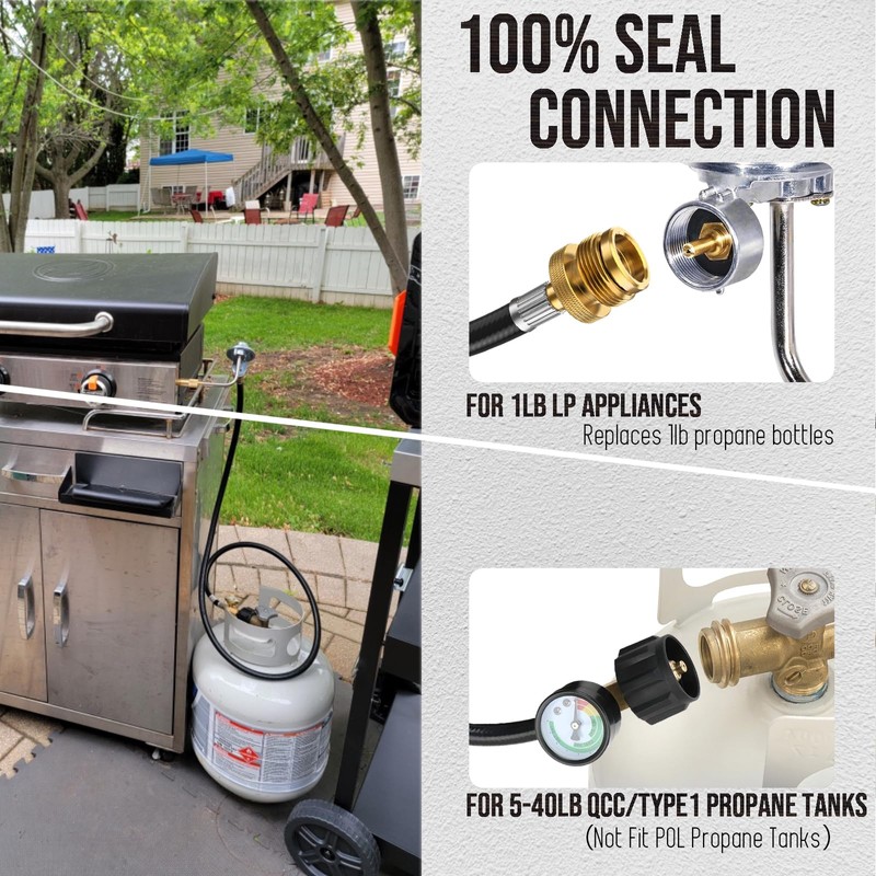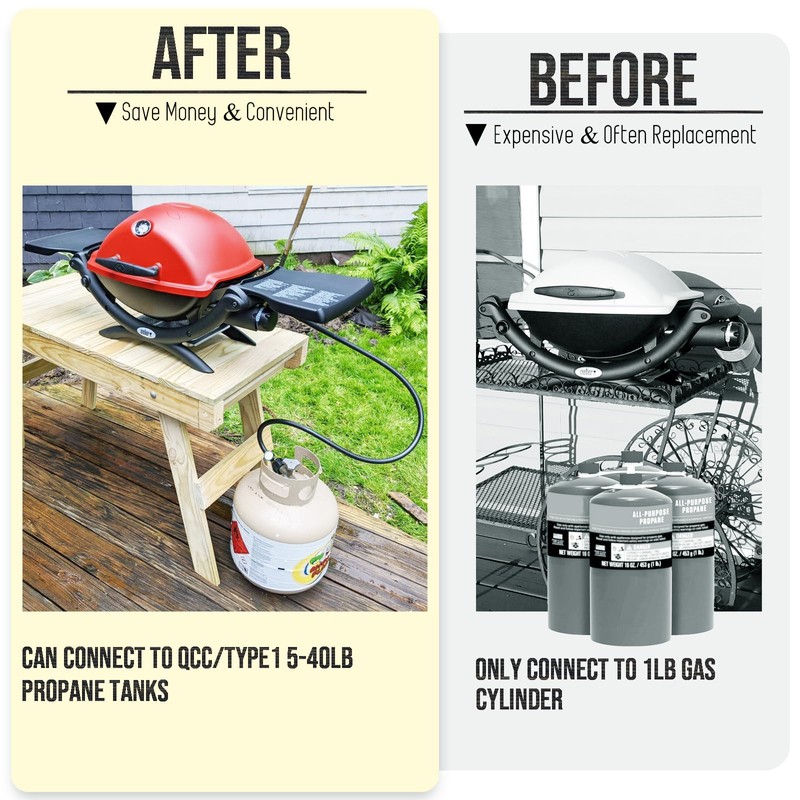 - Perfectly Fit: Connect 1 pound portable appliance to 5-40 lb QCC1(Type1) propane tank, for Mr / Big Buddy heaters, Weber Q grills, Coleman camping stoves, Blackstone 17" / 22" griddles (need griddle regulator ), tabletop fire pit, patio tabletop heater, lantern, and more 1lb appliance.