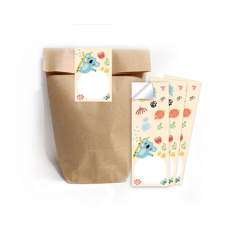 12 Gift Bags (Natural) + 12 Stickers Koala for Party Bags Guest Gift for Children's Birthday Girls Boys