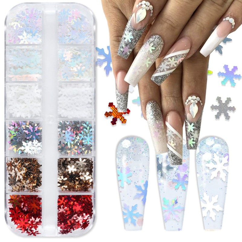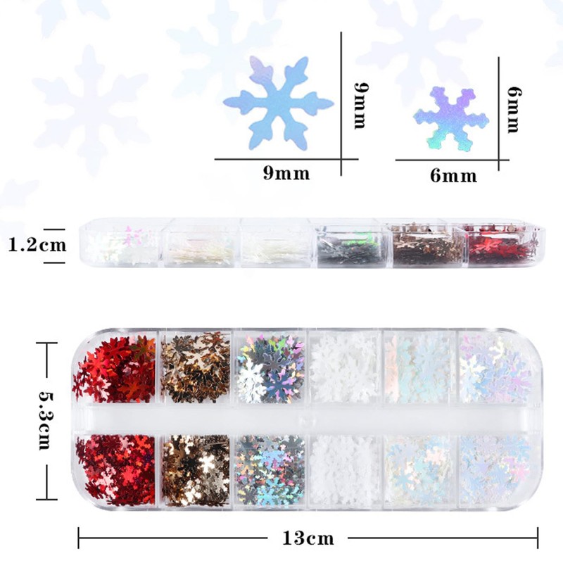 - Snowflake Glitter for Crafts: 12 Grids Laser snowflake nail glitter flakes many color are available, You can choose different colors to decorate the nails, create a variety of dazzling snowflake nail decorations.