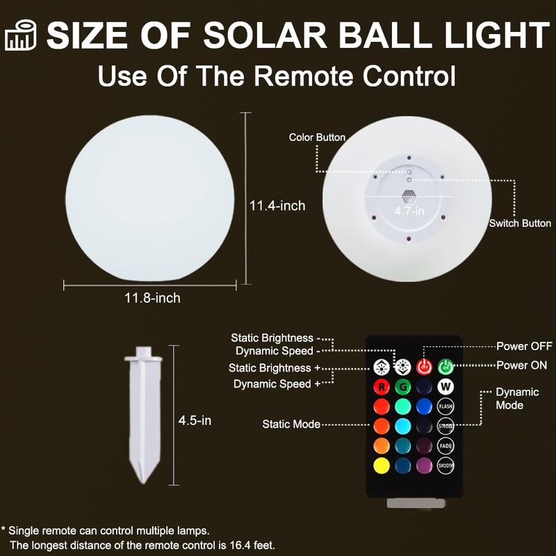 - Colorful Solar Glowing Ball Light: This attractive solar orb light has 16 vivid RGB colors with brightness control and 4 light effects with speed control, all controlled by a handy remote control that color your life with a simple press button