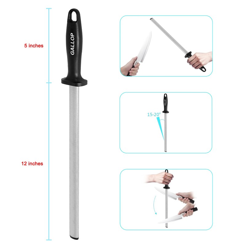 - SAFE, VERSATILE:12-inch knife sharpening steel rod is for all types of knives, including kitchen, household, sporting and pocket knives; sharpens standard knives