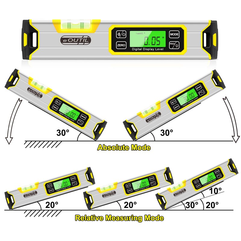 - Relative or Absolute Angle Measurement -- The regular absolute measurement mode can measure the angle against horizontal plane. This tool also features with relative measurement mode for quickly measuring angle between two measured surfaces. Hold function helps save the current angle on the display.