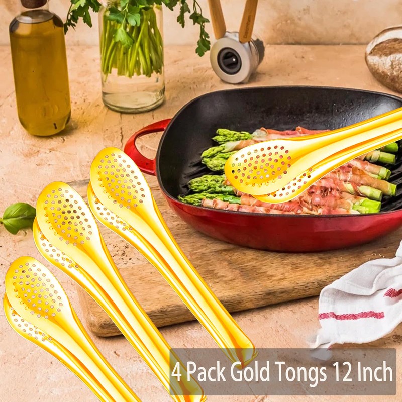 12 Inch Gold Tongs for Serving Utensils Stainless Steel Salad Tongs Serving Tongs for Buffet Dessert Party Kitchen Catering 4 Pack