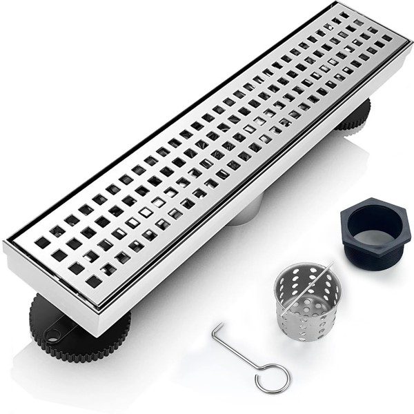 12 Inch Removable Cover Linear Shower Drain 304 Stainless Steel Rectangular Floor Drain for Kitchen Bathroom Square Hole Pattern Drain with Accessories Hair Strainer Adjustable Leveling Feet (Silver)
