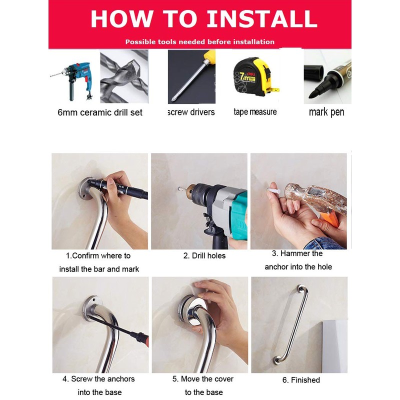 **Overview** ZUEXT 12 inch Concealed Screw Stainless Steel Grab Bar combines quality, strength and durability with a classic design to bring safety and stability to your bathroom without sacrificing style. With only two screws required per side for a secure mount, the 3 hole flange gives you installation flexibility for your unique grab bar mounting needs. This 1.0 inch diameter grab bar is fully ADA compliant and rated for up to 500 pounds. Accidents can occur, but be ready before they happen. Make bathroom safety a part of your home décor. Being safe is easier than you think. **Easy Installation with Secure Mount Anchors** Enjoy greater peace of mind in the bathroom with the ZUEXT 12-inch Grab Bar. It supports up to 500 pounds and provides a reliable handhold whether you're showering, bathing, or using the toilet. It also features a secure mount design that allows for easy, secure installation at any angle and helps ensure proper alignment. **Durable, Reliable, and Stylish** Measuring 12 inches in length and 1.0 inch in diameter, constructed from durable stainless steel, it features a corrosion-resistant finish to ensure lasting performance. Stylish end covers conceal the mounting hardware for a clean, seamless look. **What's in the Box:** 1x 12 Inch Stainless Steel Shower Grab Bar 1x Self-adhesive Stick-on Hook (2.3 x 2.3 inch, support up to 22 lbs weight) 1x Installation Screws **How to Install This Safety Bar?** Step 1: Locate wall studs where you want to install the handle; Step 2: Drill holes through the ceramic tiles or tub enclosure into the studs to start the screws; Step 3: A cover plate can be slide over the mounting plate with the holes; Each end has flat plate with 3 holes in each. Thus handle can be fastened with screws or bolts to a wall or a cabinet.